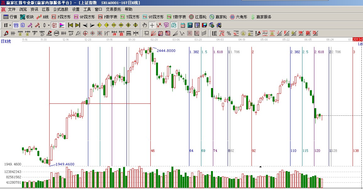 ★依據(jù)贏家江恩系統(tǒng)黃金時(shí)間周期線提示:從1949點(diǎn)至2444點(diǎn)做時(shí)間圖(3),分鐘圖時(shí)間窗18、19,日線時(shí)間窗21號(hào);