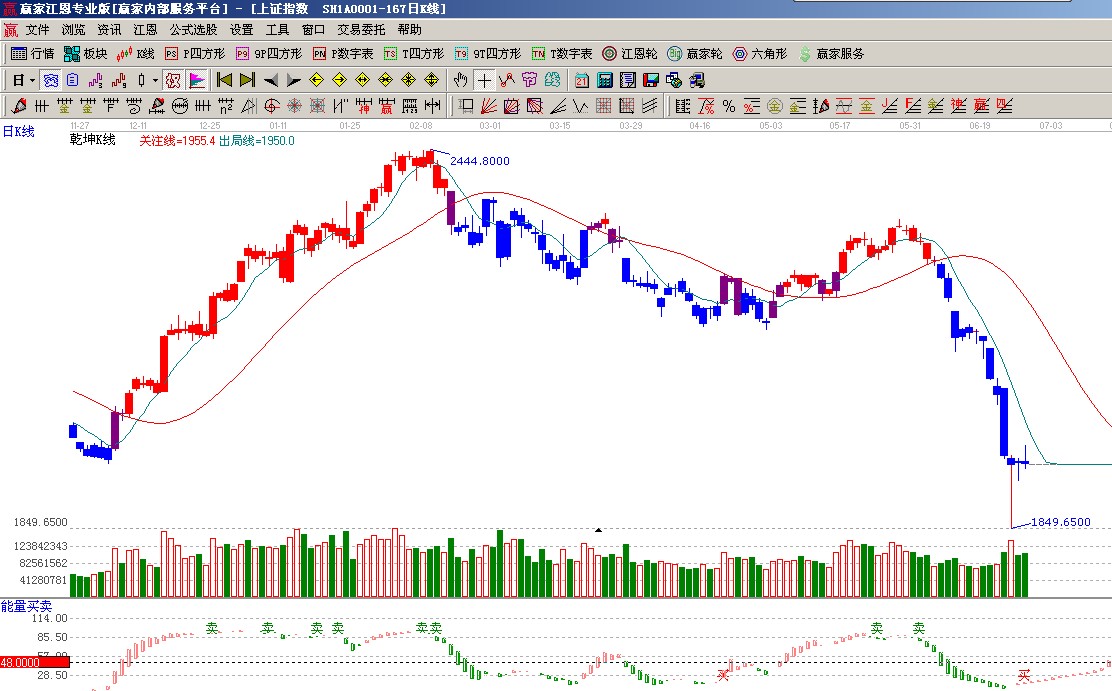 ☆依據贏家江恩系統乾坤K線提示: 藍色K線休息區,等待K線站穩出局線短線做多信號(1);