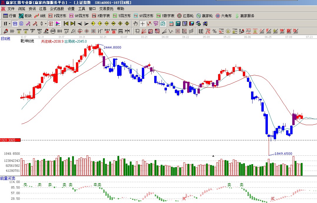 ★依據贏家江恩系統乾坤K線提示: 出局線與關注線形成金叉,紅色K線為安全信號,紅色區域看多;(1)