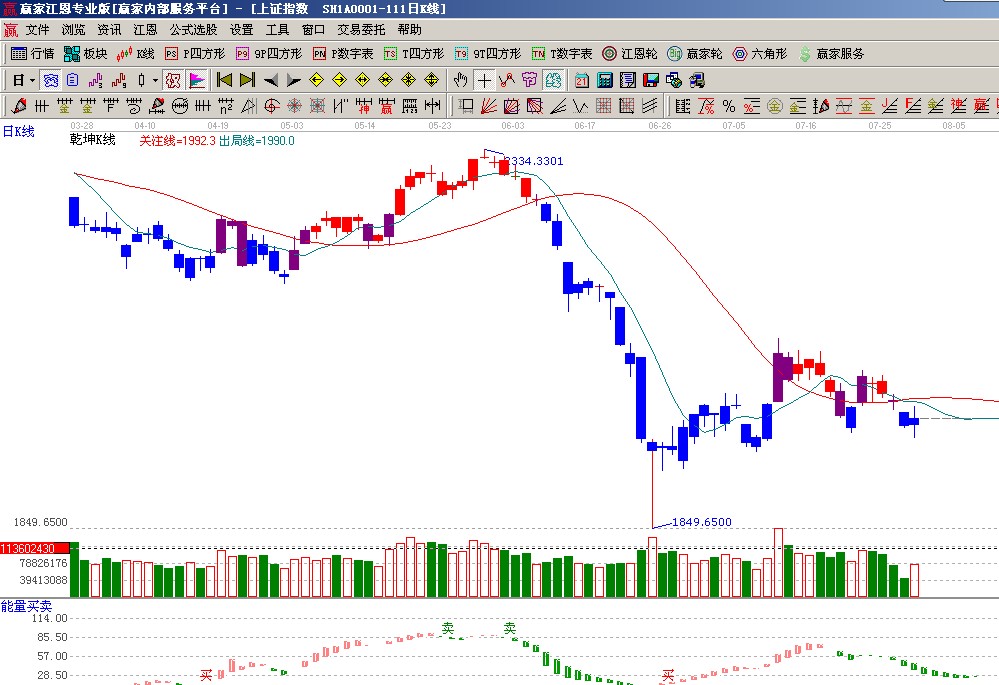 ☆依據(jù)贏家江恩系統(tǒng)乾坤K線提示: 藍(lán)色K線代表休息區(qū),等待信號的轉(zhuǎn)變;(1)