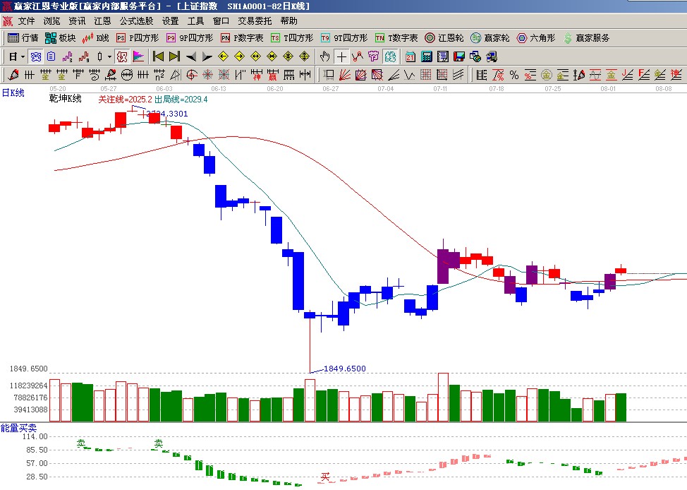 ★依據贏家江恩系統乾坤K線提示: 紫色K線轉為紅色進入可操作區,出局線與關注線形成金叉操作性更安全;(1)
