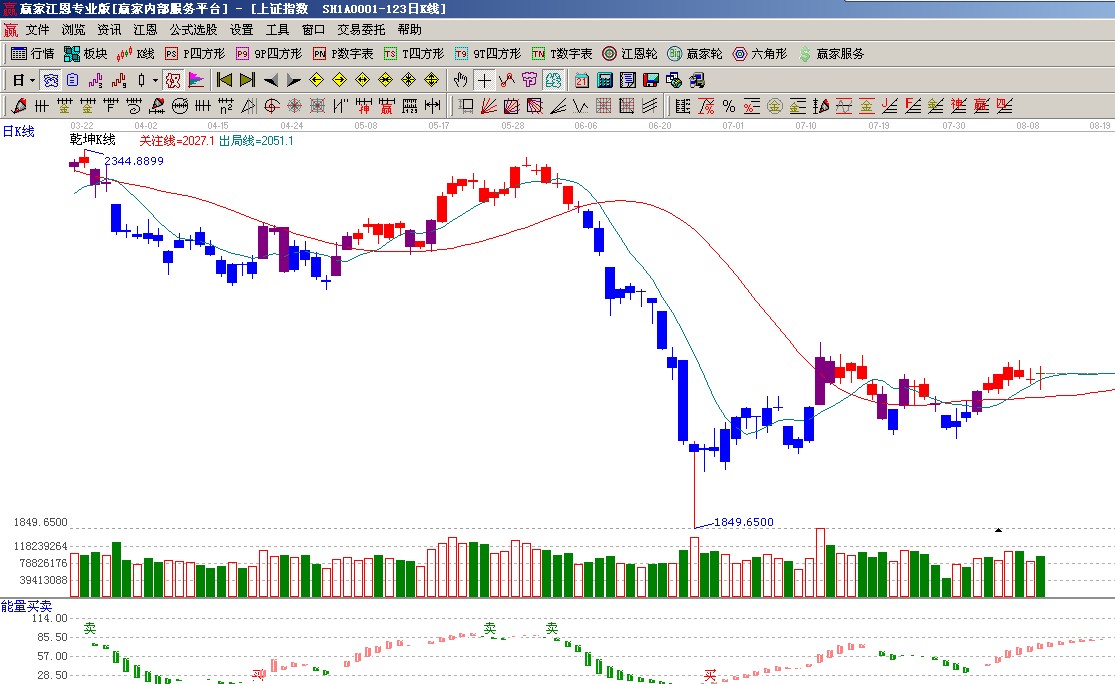 ★依據(jù)贏家江恩系統(tǒng)乾坤K線提示:下探出局線后拉回,安規(guī)則紅色為持股區(qū);(1)