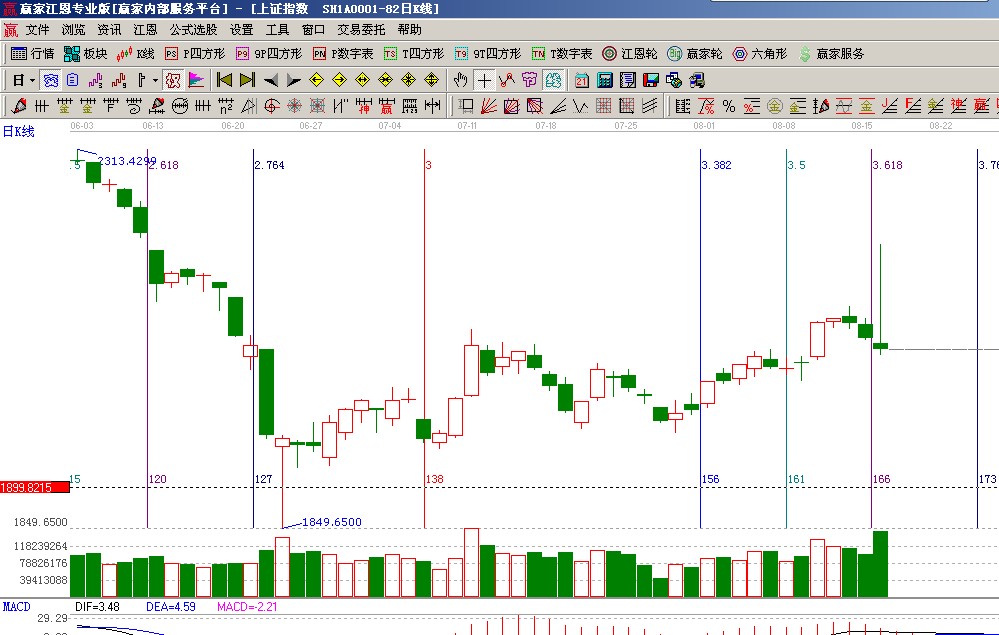 ★依據(jù)贏家江恩系統(tǒng)乾坤K線提示:K線破短線出局線,依據(jù)規(guī)則短線出局,波段減倉,等待紅色關(guān)注線(1)