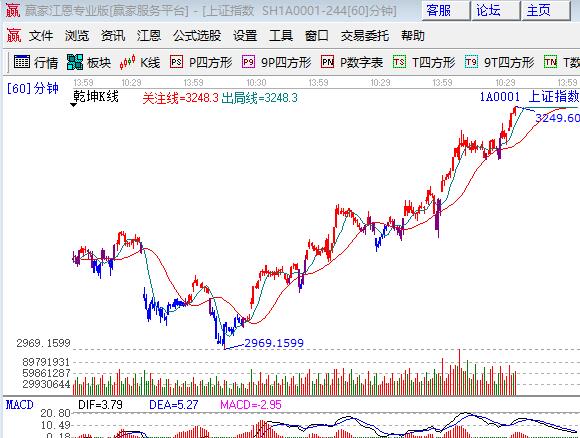 周一、周二大盤兩根陽線從極反通道外軌線直逼紅色外軌線,深成指和中小創同步上漲。板塊方面煤炭有色、石油、鋼鐵、保險等權重股領漲;題材方面,年報高送轉、次新依然是盤中熱點,互聯網金融尾盤崛起,個股普漲成交量有所放大。技術方面,突破股票分析軟件江恩百分比第二個循環的零度位置3234點,上方45度是3271點。極反通道紅色強勢外軌線是3283點,短周期藍色外軌線是3260位置,操作思路為自10份建立的波段倉待指數進入3260-3280區間選擇高拋2成,短線2成活動倉繼續做差價。贏家操作名言“逃頂晚一步不如早一步,抄底早一步不如晚一步”。3234、3223為日內支撐,3260、3271為日內阻力,僅供參考,不構成任何投資建議。