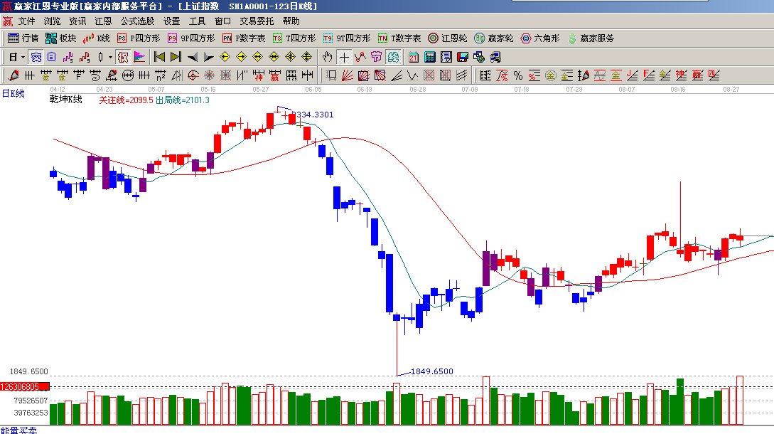 ★依據(jù)贏家江恩系統(tǒng)乾坤K線提示:短線出局線、波段關(guān)注線形成均線多頭排列,紅色K線表示看多;(1)
