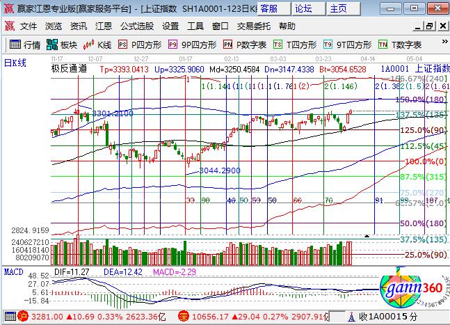 周三大盤高開縮量震蕩小漲0.33%,滬指再創新高,深成指和中小創相對較弱。板塊方面,石油上漲,銀行、券商、保險下跌;題材方面,雄安新區概念繼續領漲,開板新股和 次新股、一帶一路盤中有所表現,人工智能、蘋果概念領跌,個股漲跌互現成交量較前日縮量。技術方面,日線在江恩百分比135度3269位置震蕩,上方180度和極反通道外軌線在同一區域,短周期遇極反通道外軌線壓力,震蕩還將持續,個股分化將更明確,整體上震蕩運行對于多數個股更有利,3269、3257為日內支撐,3290、3305為日內阻力,僅供參考,不構成任何投資建議。