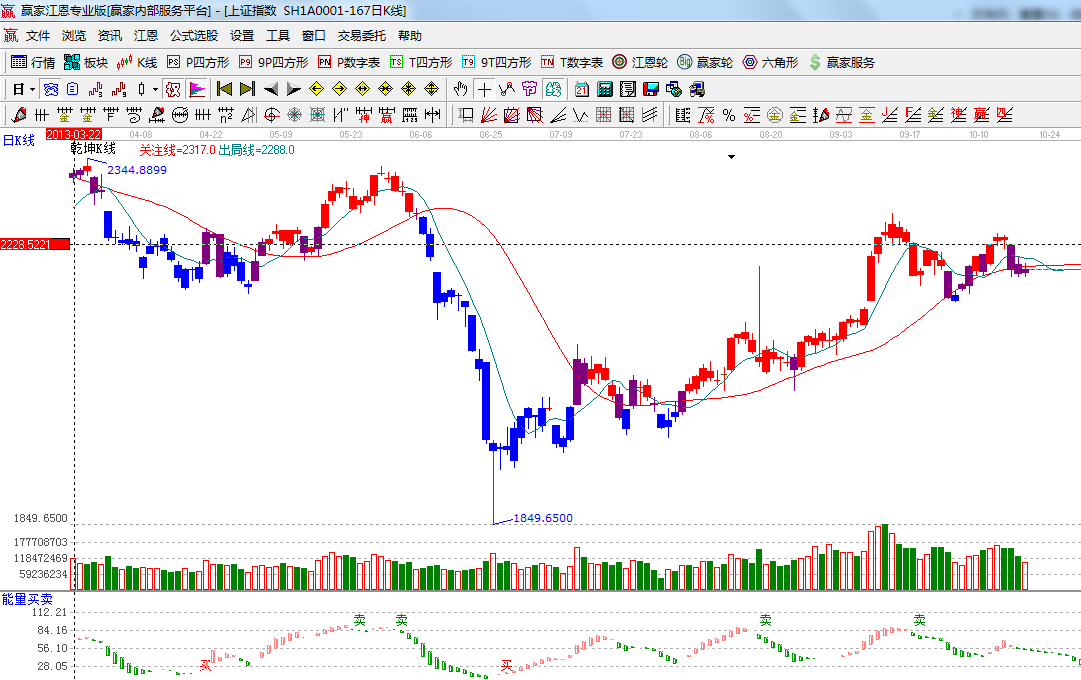★依據(jù)贏家江恩系統(tǒng)能量買賣提示:紅色柱子變成綠色,空方占據(jù)優(yōu)勢;