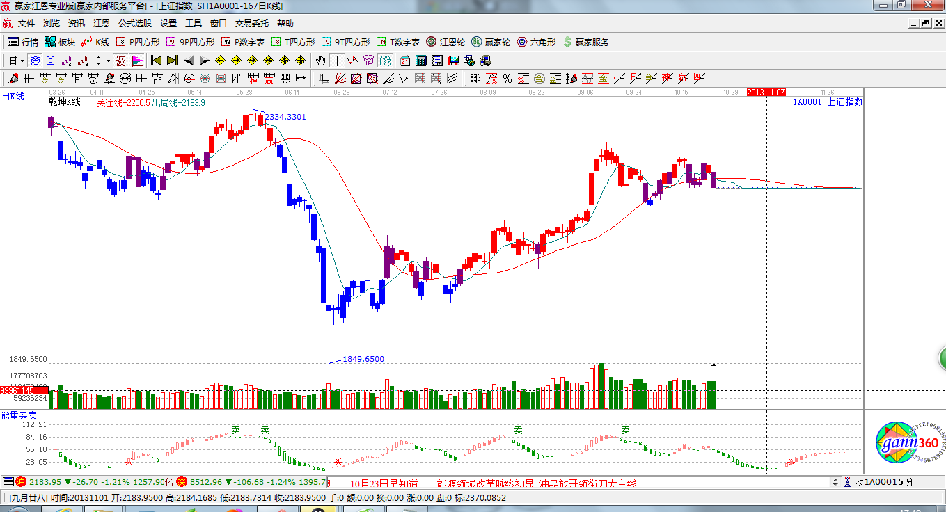 ★依據贏家江恩系統乾坤K線提示: 紫色K線出現,等待趨勢明確,轉綠則進入休息;