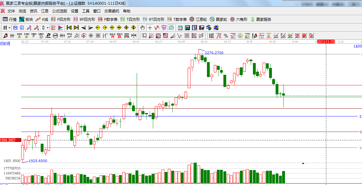 時間窗大盤上演多空大戰盤面緊張而刺激,優先股的推出猜測不局限于銀行,電力、能源、石油等均有企業涉及,受此推動銀行股全面表現良好,與其前期瘋狂的題材概念類個股則出現跌停潮,盤中最高時跌停家數達一百家之多,隨著三中全會時間的臨近以及空頭的連續十余天宣泄下午盤面開始活躍,昨日所提到看好的板塊石油改革、土地流轉表現不錯,近期盤面上炒作的題材有望延續三中全會概念;技術面指數破日線生命線進入弱勢區域,因此操作上以輕倉3成倉操作為主,趨勢明確后在做倉位上的調控;