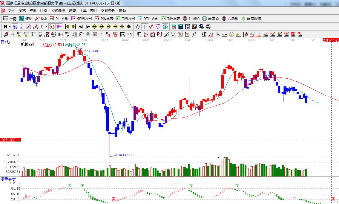 ☆依據(jù)贏家江恩系統(tǒng)能量買賣提示:綠色柱子空方占優(yōu)看空;