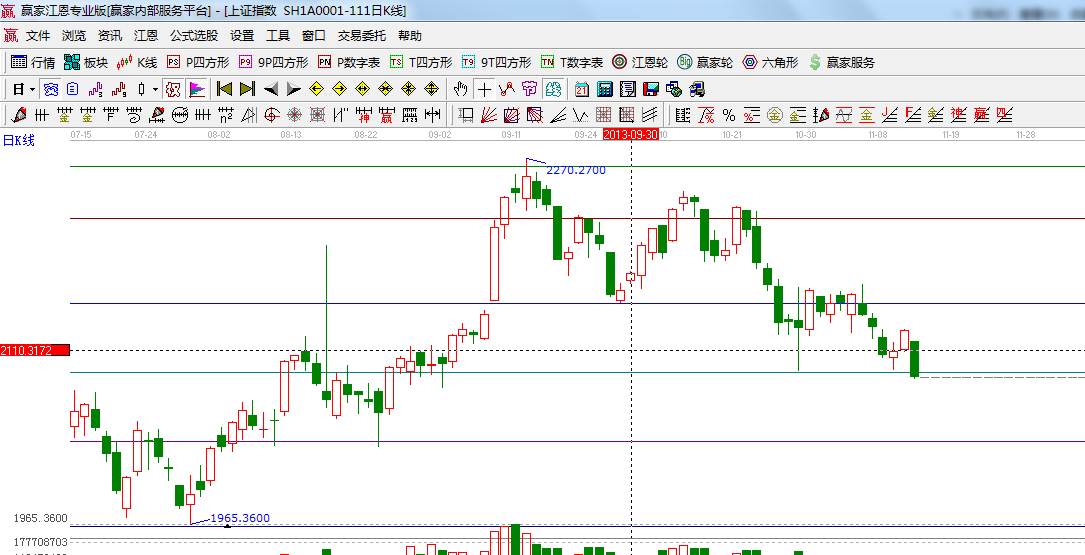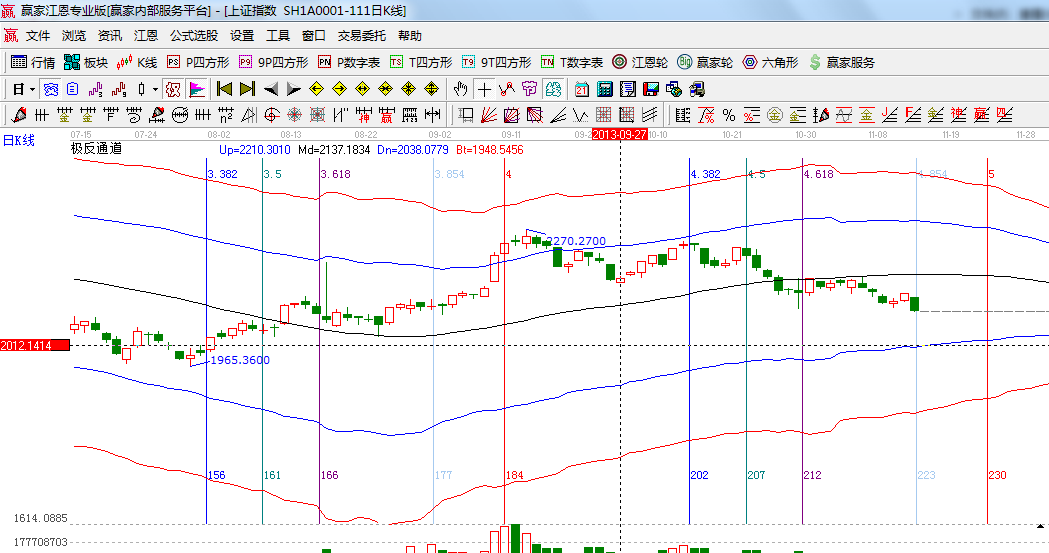 ★依據(jù)贏家江恩系統(tǒng)波段百分比延伸提示:黃金分割價格圖0.5位置是2090,0.382位置是2049;