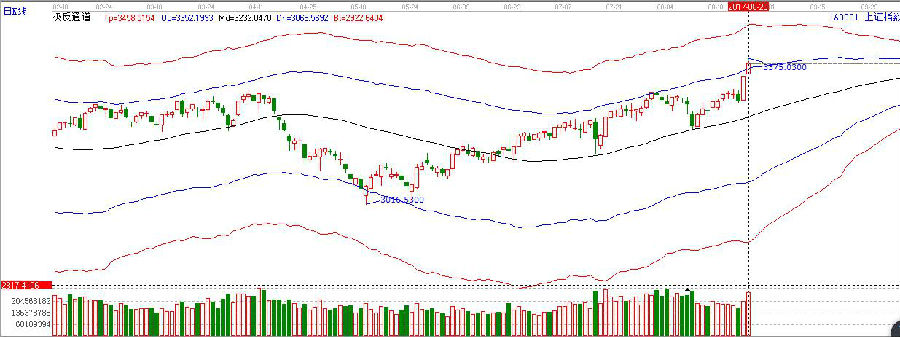 周一,滬指高開高走,強勢突破極反通道藍色上軌線,打開了新的上行空間,盤中最高沖擊45度線3380點附近,量能同比放大,但在沖高過程中五大行和一批行業龍頭股有出貨的跡象,所以,短期指數上行中或仍有反復,短期不宜盲目追高。操作上,輕指數、重個股。不追高的前提下,低吸低位放量,具有業績支撐的良好標的。