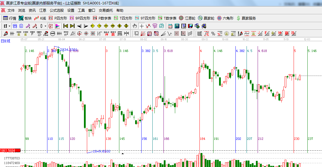 ☆依據(jù)贏家江恩系統(tǒng)波段百分比延伸提示:2444與1849點(diǎn)做黃金分割價(jià)格圖,0.382位置是2217點(diǎn),0.5位置是2150點(diǎn);