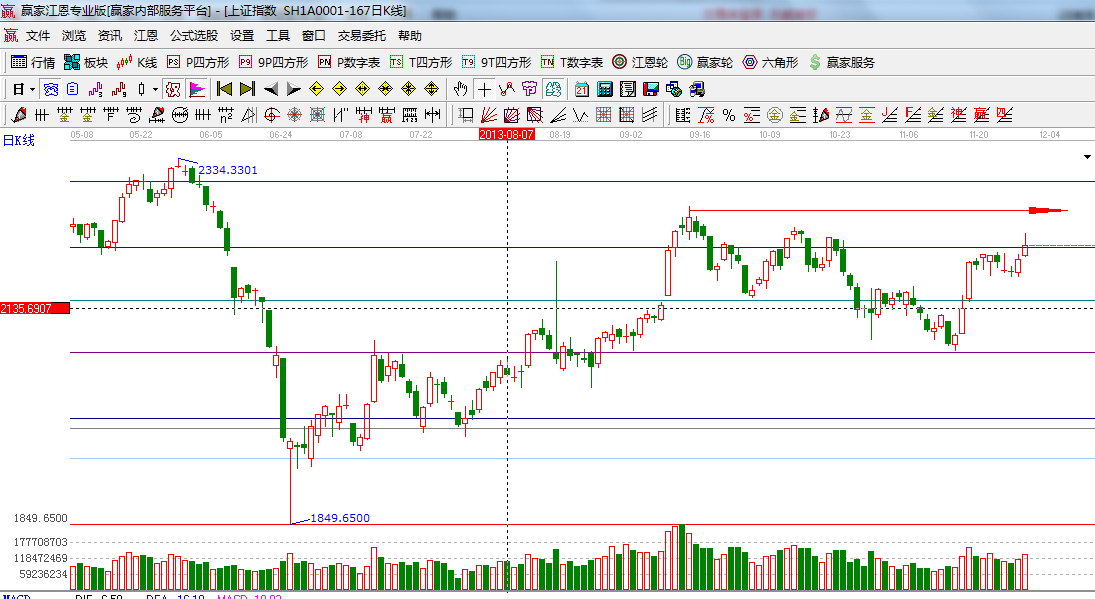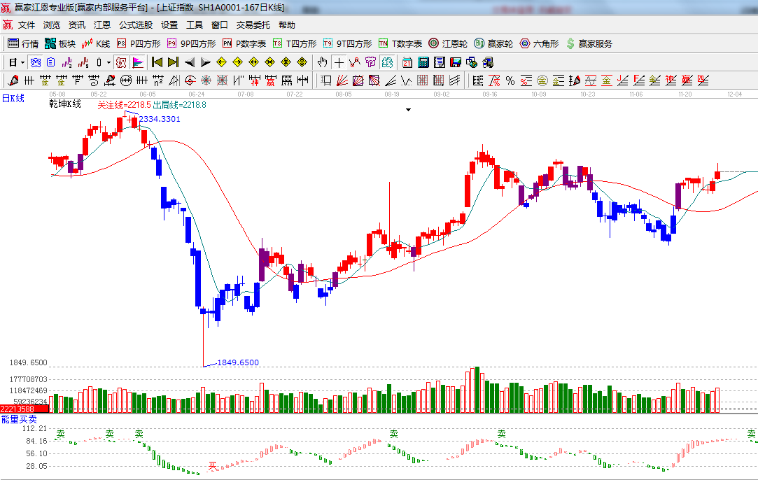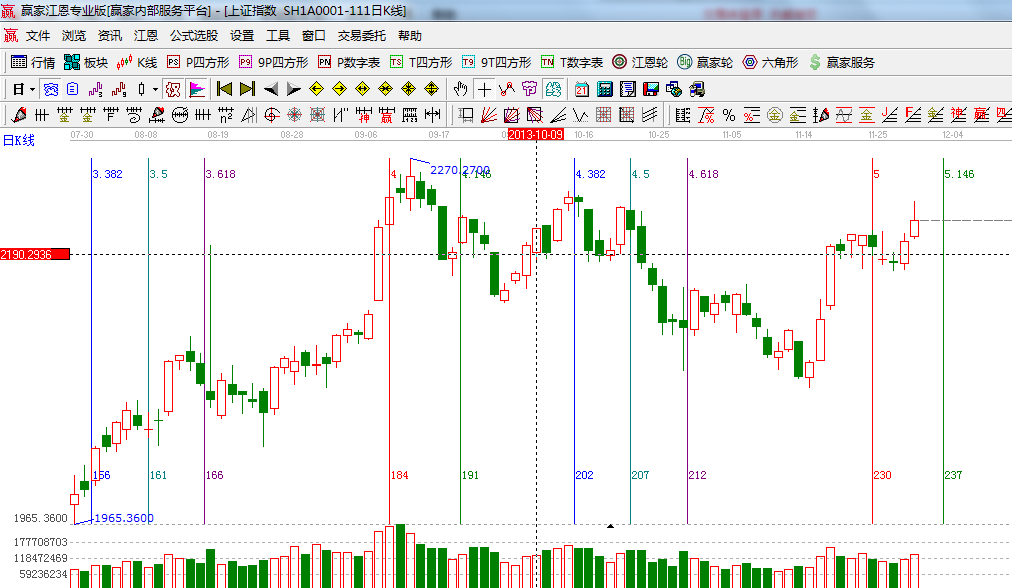 ☆依據贏家江恩系統波段百分比延伸提示:2444與1849點做黃金分割價格圖,0.382位置是2217點,上方拋壓在前期頭部2265附近;