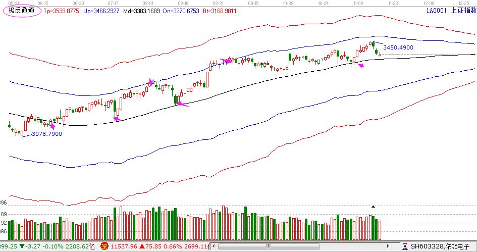 【贏家江恩點評:極反通道工具可幫助用戶解決大盤或個股趨勢判斷、價格買賣點,在日內差價高拋低吸方面更能提示其優勢?!?/strong>