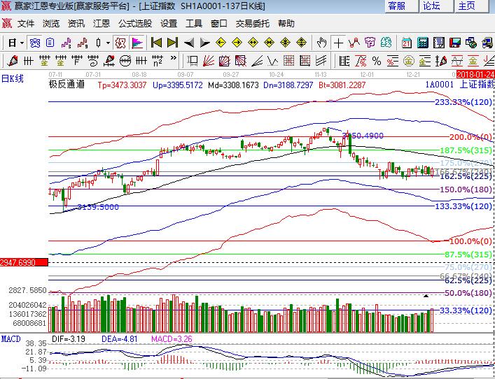 滬指周四低開高走上漲0.63%,主要是大藍籌拉抬,深市走勢較弱,創業板微跌。板塊方面,釀酒、有色、鋼鐵、煤炭、家電等板塊領漲,大金融、石油跑贏大盤;題材方面,部分次新、新能源、高送轉概念盤中表現,天然氣、維生素、大數據、芯片領跌,個股上漲居多成交量持續放大。技術方面,大盤日線圍繞江恩百分比225度3272點震蕩后拉起,收盤站在240度3288點上方,本月基本維護在225度與270度構造的空間上下震蕩,周線的時間窗銜接17年末與18年初,23號用戶群課談到本周是相對安全的,對于1月份的操作是相對謹慎的,回顧11月21號的點評,對于以年為單位的持股是可以忽略這里的中期調整,而對于趨勢交易者已在11月出局,按時間周期計算18年1、2月份是趨勢交易者分倉建中長線標的時機,對于短期漲、橫、跌三類區間已重復多次,我們應對不同的策略來應對即可,上證50繼續觀察日生命線得失。操作策略上波段4成倉持股不動,3288、3272為日內支撐,3308、3321為日內壓力。僅供參考,不構成任何投資建議。
