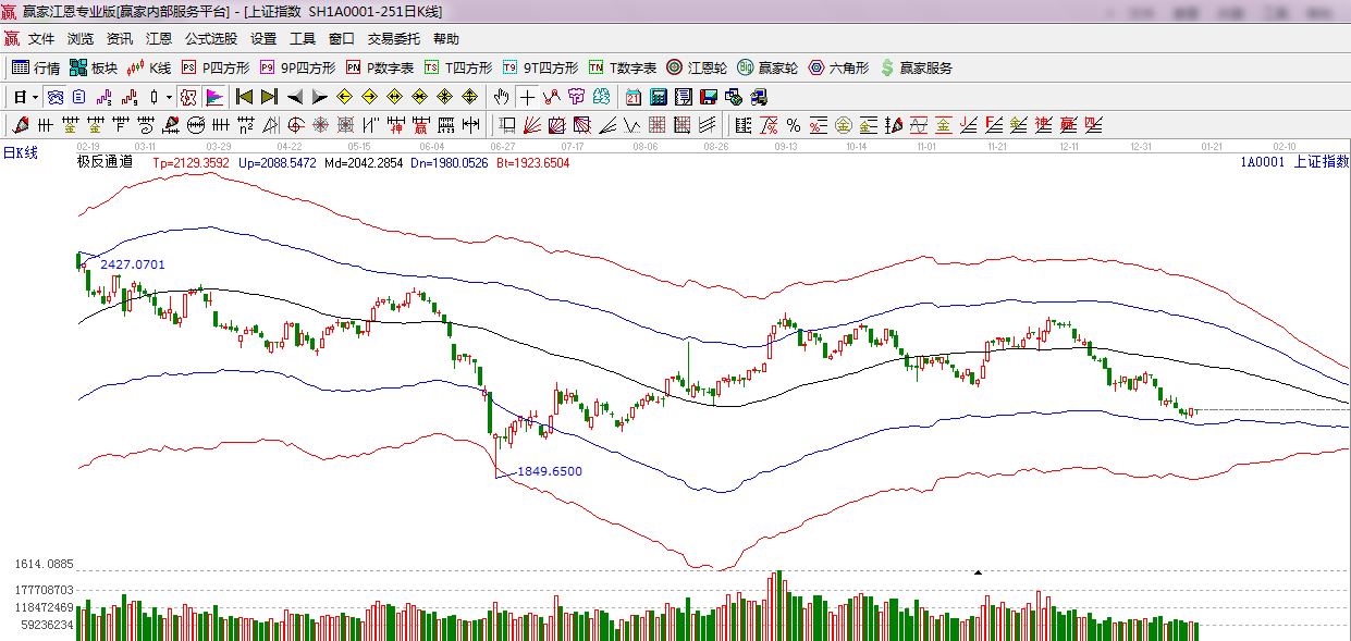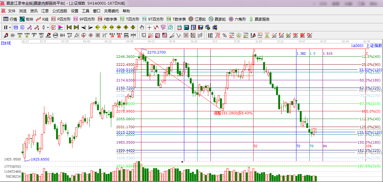 綜上所述:依據贏家江恩技術工具分析得出:多空雙方在極反通道弱勢下軌附近展開弱勢整理,時間窗口到達但量能未能有效放大,上方短期阻力留意江恩90度2031附近,第二阻力位45度2055附近,短期量能如不能有效跟進,謹防沖高回落,操作方面,嚴格控制倉位,切勿盲目追高,穩健者等待為主,星級風險提示,謹慎做多。