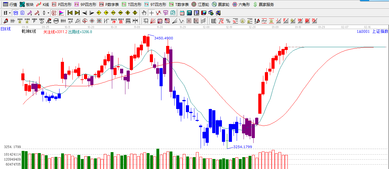 ★依據贏家江恩理論系統乾坤K線提示:紅色關注線之上,紅色可操作區域,趨勢多頭。