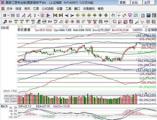 滬指周四高開縮量震蕩上漲收中陽,尾盤銀行主攻拉抬指數,深市走勢較弱,創業板小跌。板塊方面,銀行、建筑、化纖和鋼鐵板塊領漲,石油、地產、保險領跌;題材凌亂,化工漲價、一帶一路概念相對表現較好,次新分化中活躍,區塊鏈、芯片、土地流轉和5G領跌,個股漲跌互現且下跌家數略多。技術方面,滬指日線最高點觸及極反通道強勢外軌線,預計震蕩等待短周期的跟隨,上證50站在外軌線上震蕩,創業板下周是周線時間窗,觀察市場是走二八轉換還是一致性修整,選股難度越來越大,操作上不是主線不易隨意出手,倉位中長線4成倉持股不動,3466、3451為日內支撐,3487、3496為日內壓力。僅供參考,不構成任何投資建議。
