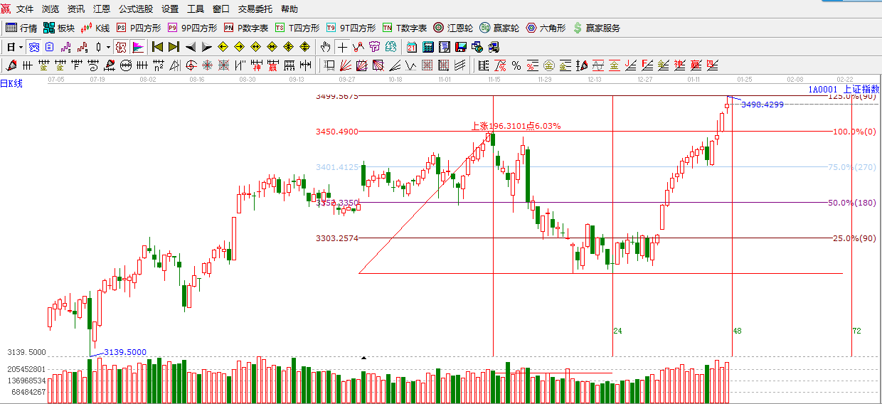江恩看盤綜述:依據(jù)贏家江恩技術(shù)工具分析得出:本周在銀行、券商的推動下創(chuàng)反彈新高,盤中雖有波折 ,但整體趨勢依舊是向上的,滬指易漲難跌,但調(diào)整風(fēng)險(xiǎn)也隨時(shí)存在,對于銀行、地產(chǎn)雖然中線看好,但不宜追漲,逢調(diào)整低吸最佳。1月22日近期 提到的窗口,周五,滬指數(shù)次沖關(guān)3500點(diǎn)未果,預(yù)計(jì)短期3500點(diǎn)關(guān)口將有大的震蕩蓄勢,機(jī)會上,市場依舊是藍(lán)籌加次新股這兩大主線,可逢低關(guān)注 其中的績優(yōu)品種。