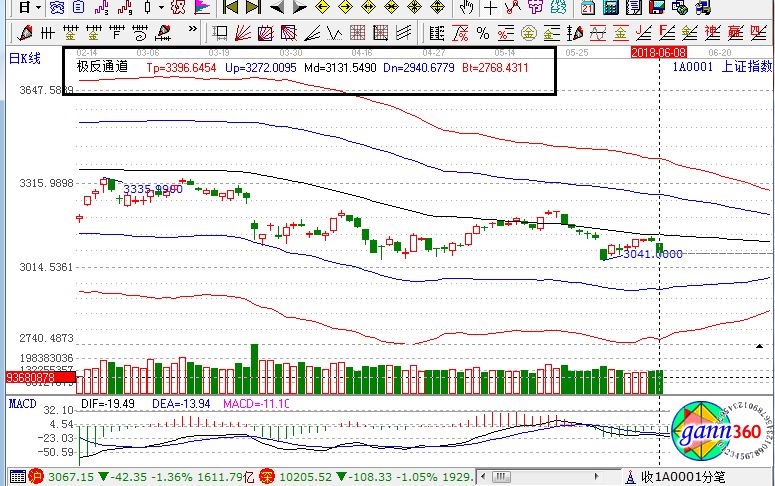 滬指跌1.36%,報收3067點;深成指跌1.05%,報收10205點;創業板跌1.09%,報收1711點。從盤面上看,小米概念、富士康概念、無人零售、5G、細胞免疫治療、半導體等少數板塊上漲,分散染料、證券、煤炭、有色、草甘膦、自由貿易港等板塊下跌。全天,滬股通凈流出6.8億元,深股通凈流入16億元。相應的極反通道指標的支撐壓力提示,如下圖所示:
