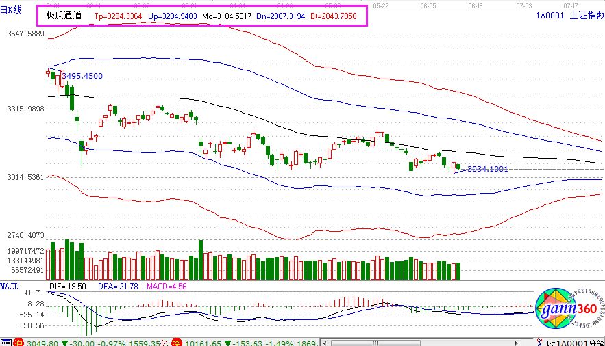 滬指跌0.97%,報收3049點;深成指跌1.49%,報收10161點;創業板跌1.57%,報收1685點。盤面上看,鋼鐵、海南等少數板塊上漲;中韓自貿區、小米概念、無線充電、次新股、送轉填權、醫療器械等板塊下跌。全天,滬股通凈流入7.8億元,深股通凈流入7.3億元。相應的極反通道指標的支撐壓力提示,如下圖所示: