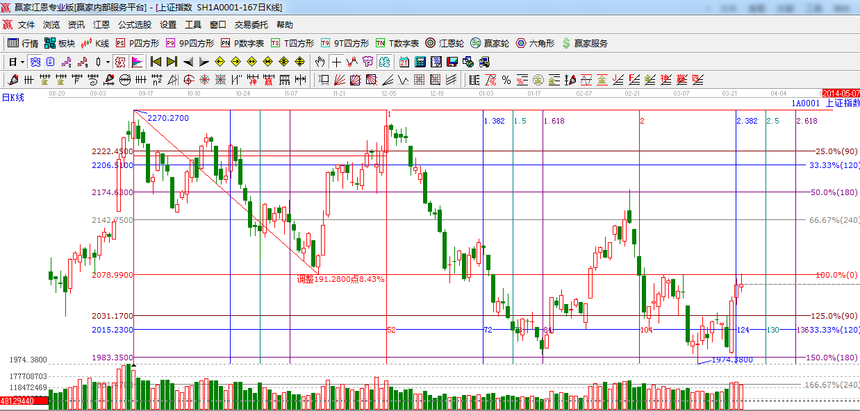 綜上所述:依據贏家江恩技術工具分析得出:生命線之上做震蕩整理,阻力位依然看2078點,支撐生命線2049點,市場出現分化跡象,上攻力度有所減弱,短期震蕩概率偏大,操作上,倉位控制5成左右。星級風險提示,看多。