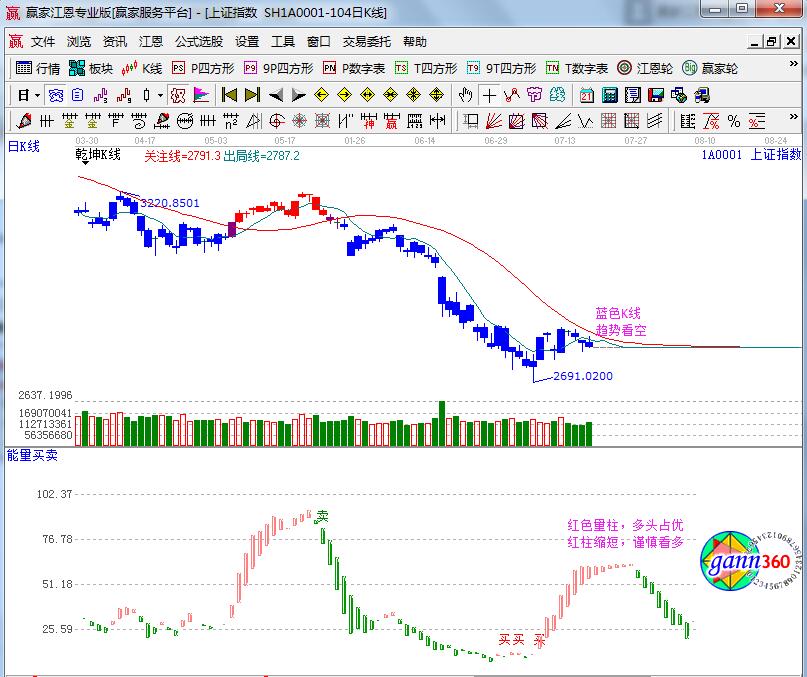 ☆依據贏家江恩理論系統乾坤K線提示:藍色K線,波段趨勢仍為空。