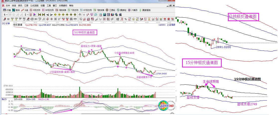 ☆依據贏家江恩理論系統極反通道提示:指數日線依托極反通道藍色下軌線震蕩,從圖中可看出5條線走勢波段延續向下方向未改變,下個交易日線藍線位置2744附近。短周期15、30、60分鐘均處于生命線下弱勢通道,單從K線位置而言,懸空可上可下狀態,20號早盤11點是日內時間窗,15分鐘生命線是2787點,對應藍色下軌線中2750附近,明日觀察時間窗與價格的有關系,遵循線上支撐線下阻力原則。