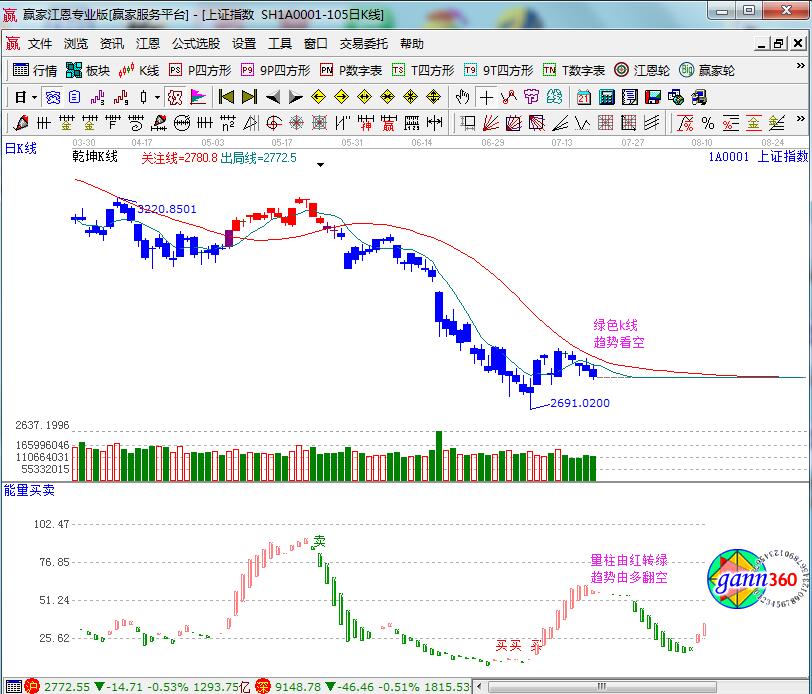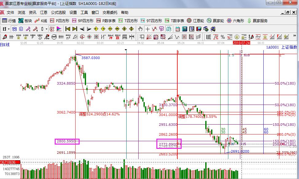 ★依據贏家江恩理論系統江恩百分比線提示:k線重心下移,收盤正好落在江恩百分比延伸線180度2772點位置(起點5月21號高點,終點是5月30號低點),明日跟蹤此線,擊穿不遠離還有機會上攻2860位置,失守則將確認7月6號。