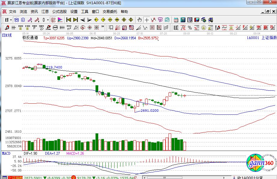 滬指漲0.26%,報2876點;深成指跌0.03%,報9178點;創業板指漲0.10%,報1561點。盤面上看,國企改革、石油采掘、二胎概念、租售同權等板塊漲幅居前;深圳國資改革、鋼鐵、軍工、水泥、化工新材料、煤炭等板塊跌幅居前。滬股通凈流入19億,深股通凈流入13億。相應的極反通道指標的支撐壓力提示,如下圖所示:
