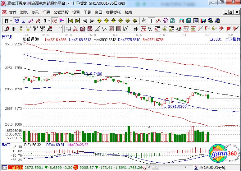 滬指跌1.81%,報2824點;深成指跌1.89%,報9005點;創業板指跌1.24%,報1542點。盤面上看,上海自貿港、航運等少數板塊上漲;深圳國資改革、鋼鐵、軍工、水泥、化工新材料、煤炭等板塊跌幅居前。滬股通凈流入5.6億,深股通凈流入5.5億。相應的極反通道指標的支撐壓力提示,如下圖所示: