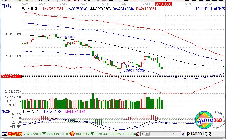截止收盤,滬指跌1.00%,報2740點;深成指跌2.03%,報8602點;創業板指跌1.89%,報1481點。盤面上看,煤炭、農業服務、豬肉、自由貿易港、海南等板塊上漲;水泥、西藏、超級品牌、集成電路、機場航運、生物制品、半導體等板塊跌幅居前。滬股通凈流出4.2億,深股通凈流入10億。相應的極反通道指標的支撐壓力提示,如下圖所示: