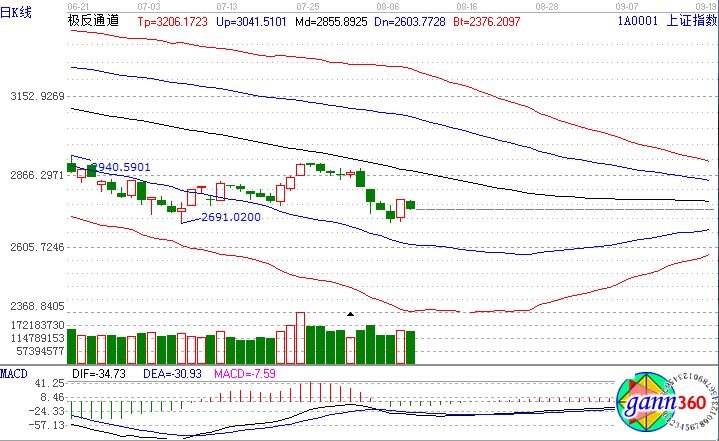 截止收盤,滬指跌1.27%,報(bào)2744點(diǎn);深成指跌2.02%,報(bào)8499點(diǎn);創(chuàng)業(yè)板指跌2.14%,報(bào)1447點(diǎn)。盤面上看,水泥、鋼鐵、石油采掘、農(nóng)業(yè)、新疆等板塊上漲;集成電路、次新股、芯片、細(xì)胞免疫治療、食品安全等板塊跌幅居前。滬股通凈流入9.5億,深股通凈流入8億。相應(yīng)的極反通道指標(biāo)的支撐壓力提示,如下圖所示: