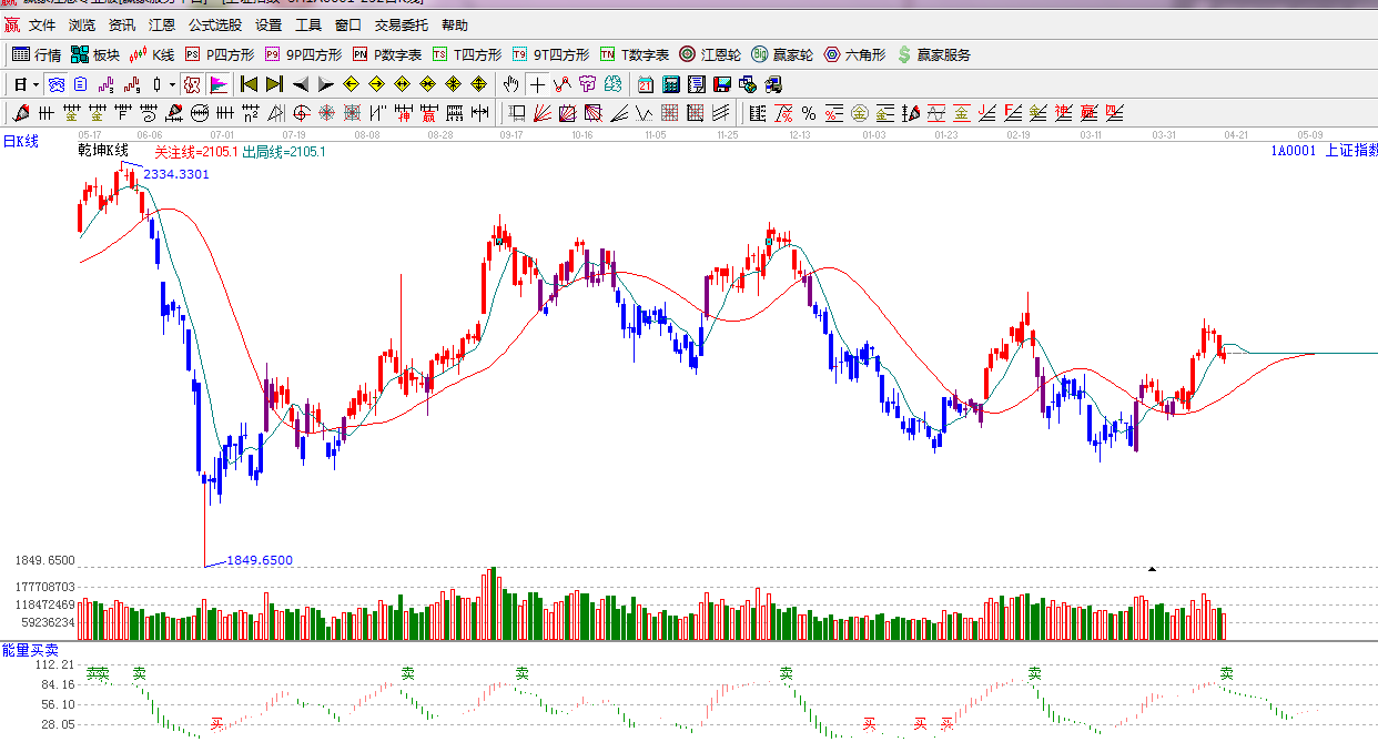 ☆依據贏家江恩系統能量買賣提示:處于紅色柱子轉入綠色柱子的臨界點,并出現“賣”字信號,短線看空。