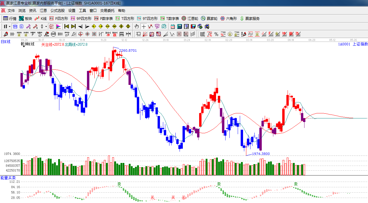 ★依據(jù)贏家江恩系統(tǒng)乾坤K線提示:紫色警示信號,并收盤站上紅色關(guān)注線,在K線沒由紫色變?yōu)樗{(lán)色之前 ,短期謹(jǐn)慎看空。