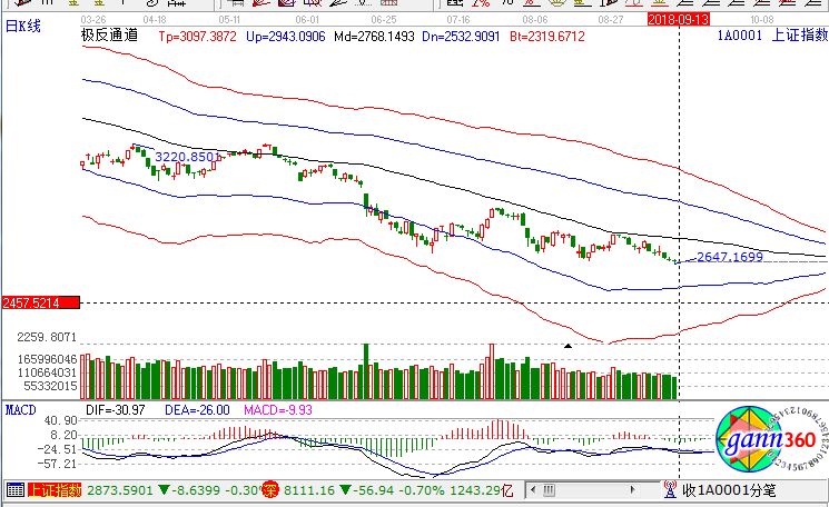 滬指跌0.33%,報收2656點;深成指跌0.70%,報收8111點;創業板跌0.67%,報收1385點。從盤面上看,軍工、大飛機、造紙、鋰電池、海工裝備、無人機等板塊上漲;白酒、醫藥、分散染料、人臉識別、細胞免疫治療、豬肉等板塊跌幅居前。滬股通凈流出7.5億,深股通凈流出1.8億。相應的極反通道指標的支撐壓力提示,如下圖所示: