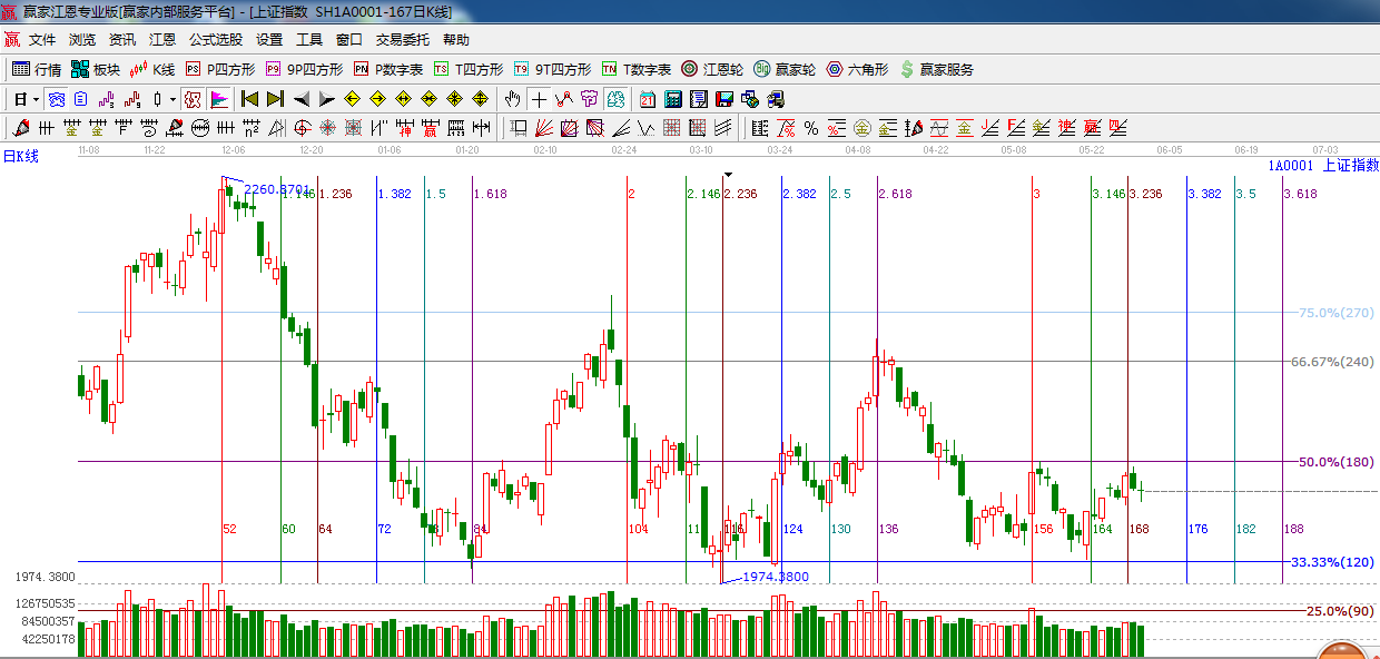 江恩看盤綜述:依據贏家江恩技術工具分析得出:上周在江恩180度2060點位置遇阻回落,上周五延續震 蕩走勢,收十字星,量能萎縮,依據規則,本周繼續關注生命線爭奪,如不能收復,短期仍將保持震蕩 下跌態勢。操作上,倉位保持3成左右。
