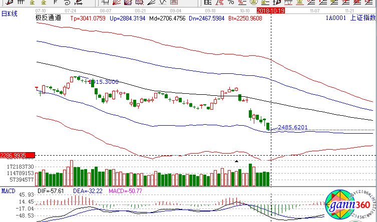 滬指全天再現單邊下挫走勢,股指再度失守2500點,個股一片慘綠,逾百只個股跌停,中國石油、中國交建、中國鐵建等一批中字頭權重股砸盤,市場強勢板塊相繼補跌。滬指跌2.94%,報收2486點;深成指跌2.41%,報收7187點;創業板跌2.18%,報收1205點。從盤面上看,海南、油改、黃金、煤炭、高送轉、天然氣等板塊領跌。應的極反通道指標的支撐壓力提示,如下圖所示: