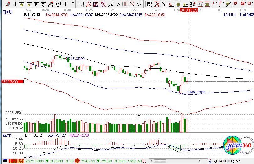 滬指漲0.33%,報收2603點;深成指跌0.39%,報收7545點;創業板跌0.62%,報收1284點。從盤面上看,銀行、證券、保險、知識產權保護、債轉股、知識產權保護等板塊領漲;白酒、食品安全、石油、粵港澳大灣區、海工裝備等板塊領跌。滬股通凈流入22億,深股通凈流出5.9億。相應的極反通道指標的支撐壓力提示,如下圖所示: