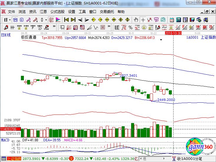 滬指全天再現(xiàn)單邊下挫走勢(shì),上證50指數(shù)大跌3%,受貴州茅臺(tái)業(yè)績(jī)不及預(yù)期跌停帶動(dòng),釀酒、醫(yī)藥、家電等白馬股集體殺跌,今世緣、古井貢酒、海天味業(yè)、水井坊等多只個(gè)股跌停,大金融板塊也集體低迷,招商銀行盤中一度大跌7%,大消費(fèi)集體重挫,對(duì)場(chǎng)內(nèi)資金情緒打擊較大。滬指跌2.18%,報(bào)收2542點(diǎn);深成指跌2.43%,報(bào)收7322點(diǎn);創(chuàng)業(yè)板跌1.01%,報(bào)收1250點(diǎn)。從盤面上看,白酒、煤炭、自由貿(mào)易港、粵港澳大灣區(qū)、物流、煤化工等板塊領(lǐng)跌。滬股通凈流入27億,深股通凈流入1.7億。相應(yīng)的極反通道指標(biāo)的支撐壓力提示,如下圖所示:
