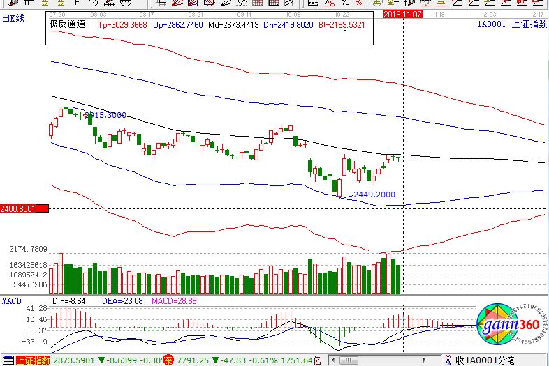 滬指跌0.23%,報(bào)收2659點(diǎn);深成指跌0.61%,報(bào)收7791點(diǎn);創(chuàng)業(yè)板漲0.02%,報(bào)收1349點(diǎn)。從盤面上看,創(chuàng)投、獨(dú)角獸、上海自貿(mào)區(qū)、石油開采、租售同權(quán)等板塊領(lǐng)漲;次新股、殼資源、證券、白酒、ST板塊、化工新材料等板塊領(lǐng)跌。滬股通凈流出5億,深股通凈流出9億。相應(yīng)的極反通道指標(biāo)的支撐壓力提示,如下圖所示: