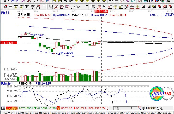 滬指漲1.36%,報收2668點;深成指漲1.18%,報收8002點;創業板漲1.41%,報收1405點。從盤面上看,高送轉預期、獨角獸概念、次新股、證券、電子發票、創投、數字中國等板塊漲幅居前。滬股通凈流入24億,深股通凈流入3.5億。相應的極反通道指標的支撐壓力提示,如下圖所示: