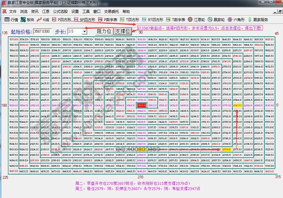 ☆依據(jù)贏家江恩理論系統(tǒng)江恩價(jià)格四方形提示:以3587為起點(diǎn),做江恩價(jià)格四方形圖。周二,指數(shù)早盤開在2609點(diǎn),剛好處于270度2607附近。全天震蕩走低,剛好收在315度2579點(diǎn)。周三,穩(wěn)住2579,反彈壓力看2607;失守2579,將考驗(yàn)支撐2547。