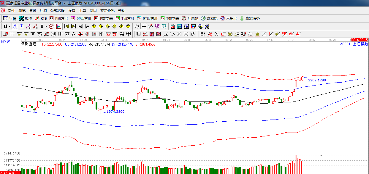 極反通道提示:指數突破2200再創年內新高,逼近紅色外軌阻力線,預計明日大盤將沖高回落。
