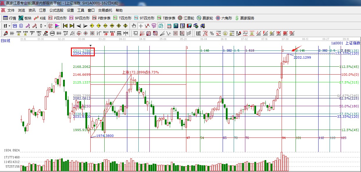 江恩看盤綜述:依據贏家江恩技術工具分析得出:午后指數突破2200在創年內新高,量能同比縮小,周五關注上方阻力2204-2211區間阻力,預計指數將小幅沖高后回落。操作上,合理控制倉位,做好高拋低吸。