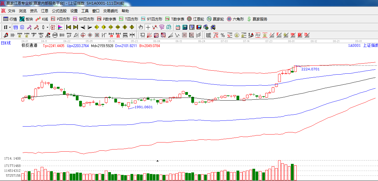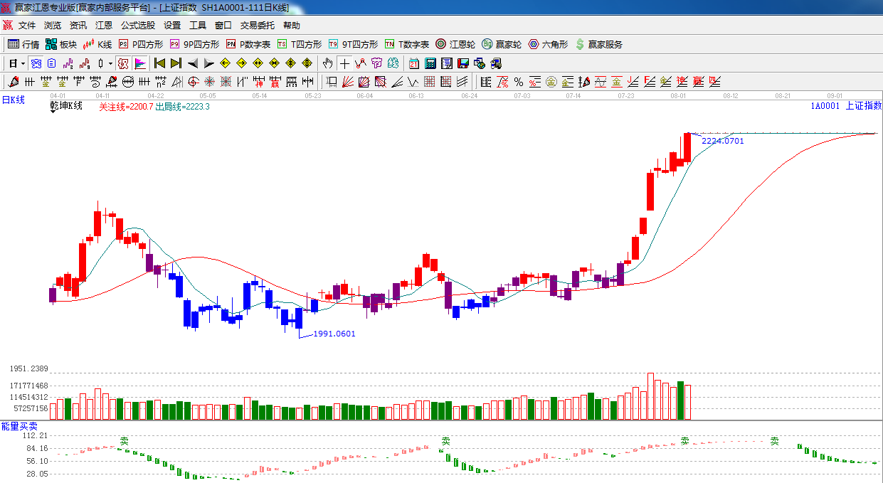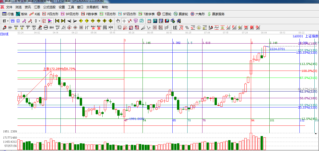 江恩看盤綜述:依據(jù)贏家江恩技術工具分析得出:周一指數(shù)在權重的全面推動下,再創(chuàng)新高,量能較前期縮小,預計短期指數(shù)將震蕩沖高后回落。上方阻力為江恩180度 2232點,225度2254點,時間窗口8月6日。操作上,合理控制倉位,做好高拋低吸。