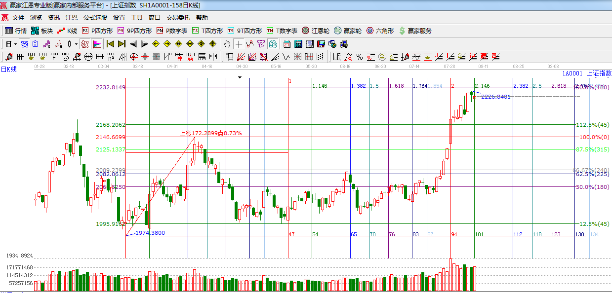 江恩看盤綜述:依據贏家江恩技術工具分析得出:權重股回落,創業板,中小板反彈,指數在極反通道外軌阻力附近探底回升,上方阻力180度位置2232附近,預計短期繼續維持高位震蕩走勢。 操作上,合理控制倉位,做好高拋低吸。