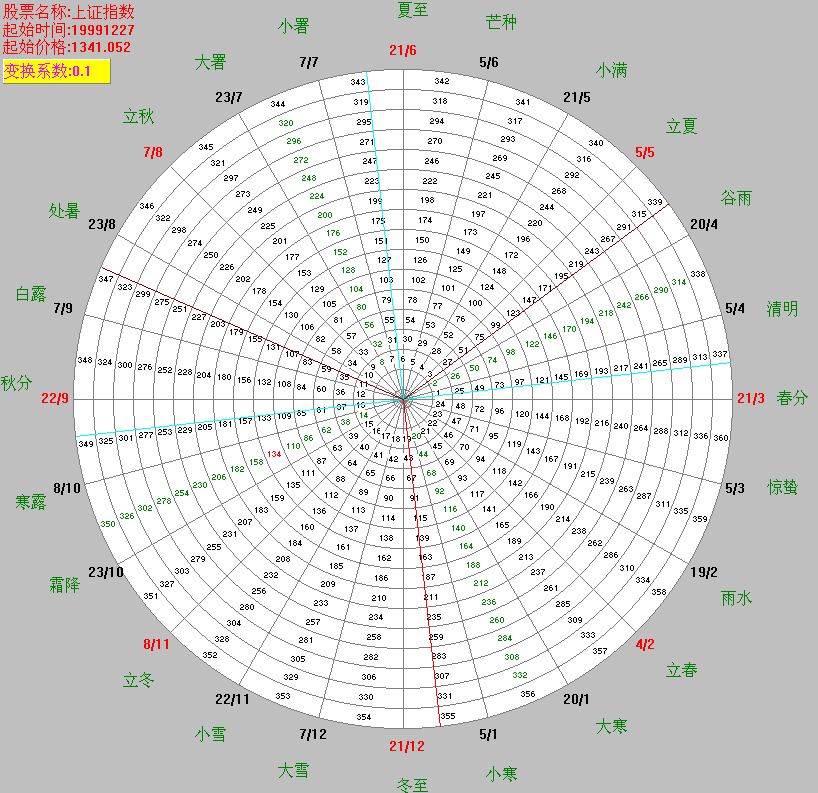 如果股價(jià)或指數(shù)較大或較小不能在360數(shù)的輪中輪顯示,則可以選擇適當(dāng)?shù)淖儞Q系數(shù),將股價(jià)或指數(shù)進(jìn)行變換使其對應(yīng)輪上的一個數(shù)字,這個數(shù)字是用紅色表示的。