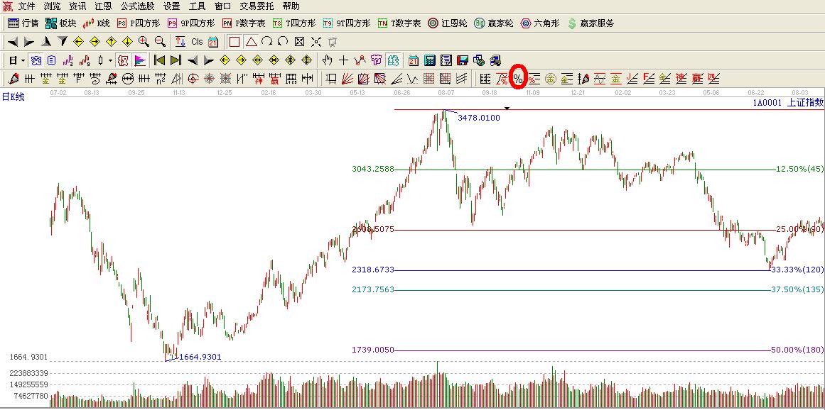 然后我們用江恩價格百分比在大盤2009-08-04日3478.01點作圖計算支撐位置。用心的朋友不難發現其重要的秘密,那就是他們都有45度【12.5%】90度【25%】120度【33.33】180度【50%】那么他們的點位是如何計算出來的呢?這些點位都跟3478.01點都有這重要行的關系;45度位置如何計算出來的呢?